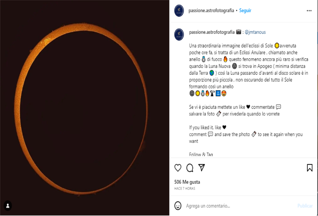Este evento astronómico fue realmente fascinante. El eclipse anular, a diferencia de los eclipses totales, ocurre cuando la Luna se encuentra un poco más lejos de la Tierra en su órbita elíptica, por lo que no cubre completamente el disco solar. En lugar de eso, se forma un “anillo de fuego” alrededor del Sol.